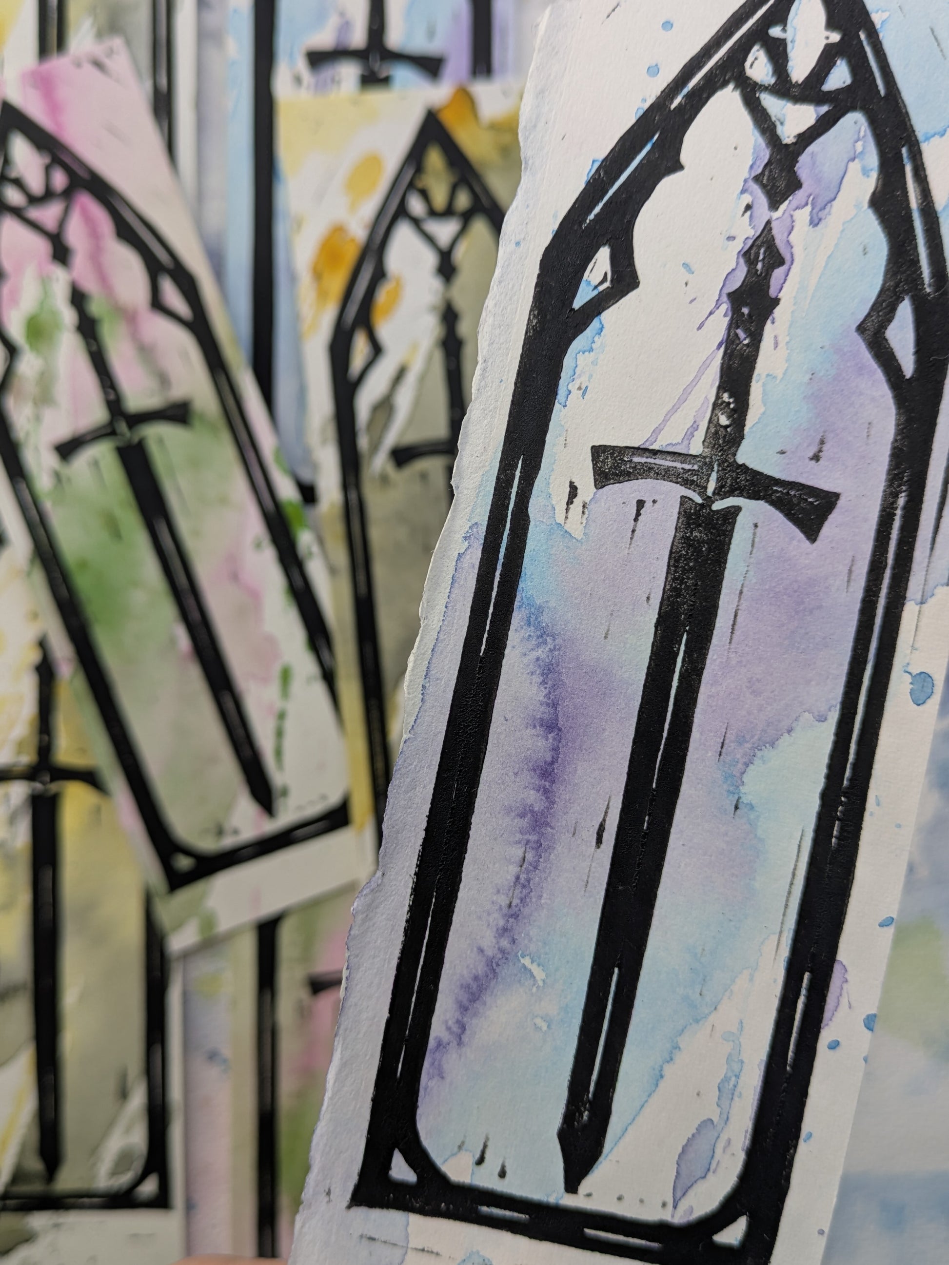 A hand-painted and hand-printed bookmark featuring a gothic archway and sword design. Available in 3 colours - blue & purple, green & pink, black & yellow.