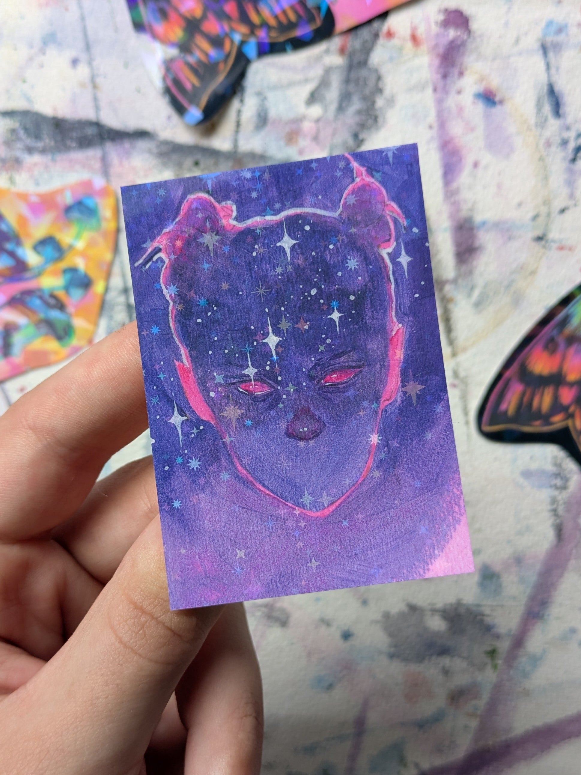 Based on my 'Star Girl' sketch - these are great to stick on laptops, water bottles, notebooks or anything else! This version is holographic and has a starry pattern.