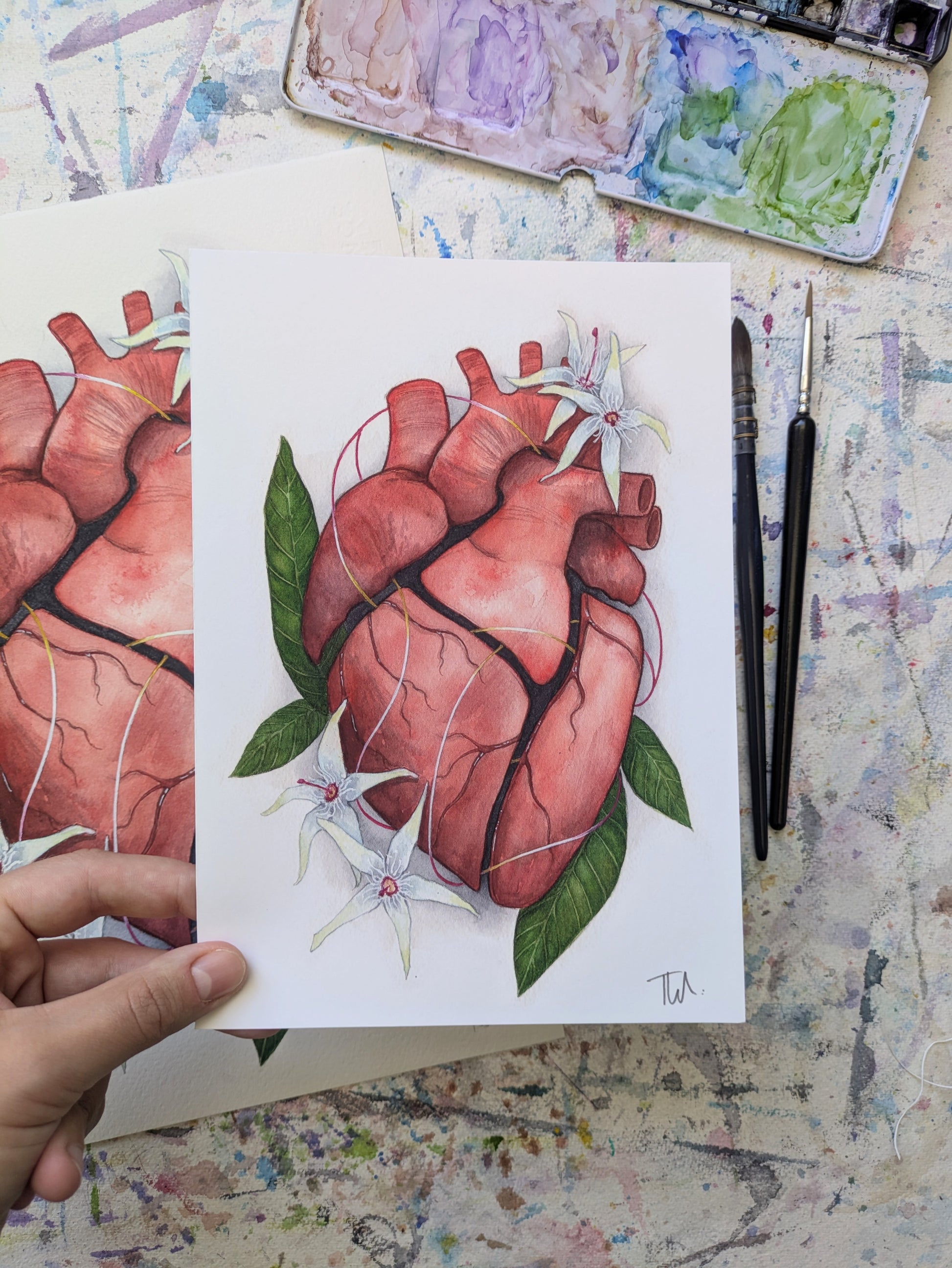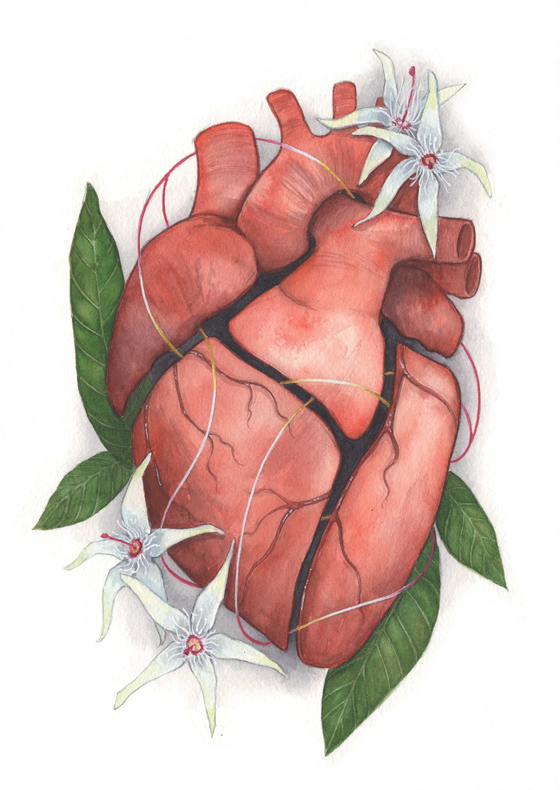 'Poisoned Rhythm' features an anatomical heart wrapped in Ryania speciosa - a poisonous plant found in South America. It produces ryanodine, which went on to name the ryanodine receptor, which I studied for my PhD and inspired this painting.